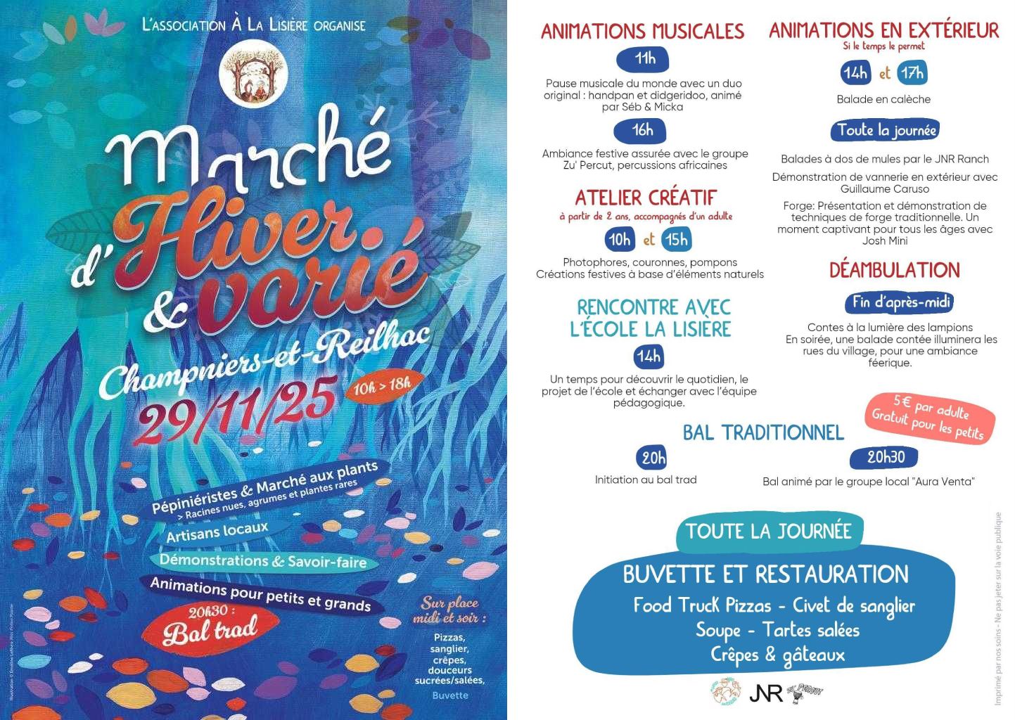 L’association À la Lisière vous convie à son marché “d’hiver et varié” le 29 novembre, de 10h à 23h à Champniers-Et-Reilhac (24360).Un rassemblement festif et participatif autour du thème de l’enracinement.Une invitation à célébrer la nature, les savoir-faire et la créativité à travers la musique, le conte, les ateliers, l’artisanat local, le marché aux plants et un bal traditionnel.